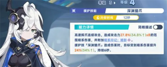 值得一提的是她的技能效果上面有12秒的持续时间,所以这个的易伤能力只要在敌人身上施加的话,那么后续在敌人身上影响的时间会有6秒,但是她的援护技能效果上面,每一次利用爪击进行攻击的情况下,带来的应急效果也是带有她本身的暗属性能力的,那么在这样的情况下面,她使用以上的效果也会有一个真空期,在她技能真空期的时候,这里会有两秒的时间,需要队伍里面其她角色为她带来一些足够的辅助,这样才可以达到珂塞特的最高强度。