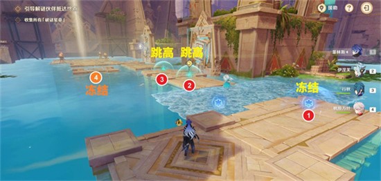目标:通过冻结水面制造可通行平台,并配合跳高越过障碍。