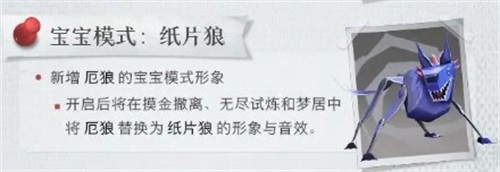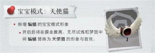 超自然行动组天使猫和纸片狼怎么样,宝宝模式新增蝙蝠和厄狼——天使猫和纸片狼,新增蝙蝠的宝宝模式形象,开启后将在摸金撒离、无尽试炼和梦居中,将蝙蝠替换为天使猫的形象与音效。还没有发现的玩家们可以退出游戏重进后就能看到。