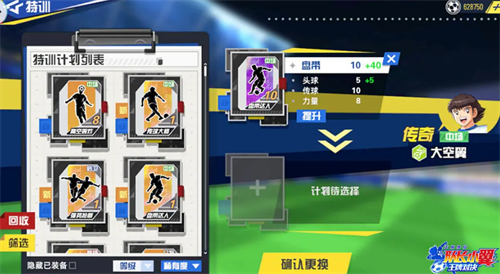 其中特训卡当中也会为大家介绍,他们带来的词缀属性加成是在哪一方面,以及带来的属性数值是有多少加成效果,比如在这里如果大家想要给传奇角色太空翼,来进行特训卡搭配的话,这里大家就可以给他装配上一些带有盘带属性的特训卡,因为毕竟太空翼本身自己的带球效果就比较好,游戏当中也可以根据他的定位来找到这类效果提升的能力,这样他可以在场内有更多的得分机会,那么通过特训卡为他进行加成,之后大家还可以注意,这里除了基础的装备卡进行计划装备之外,大家还可以通过特训卡升级来达到球员提升的效果。