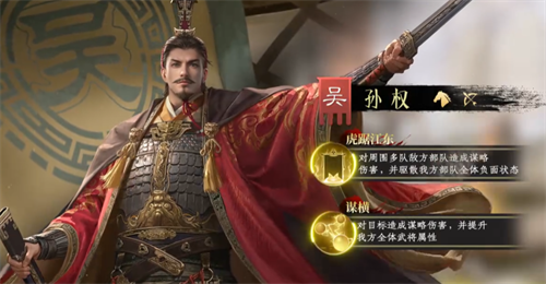 首先为大家推荐的是孙权,孙权这个武将目前。在他自身的技能效果当中,可以给敌人带来的是谋略类型的伤害效果,并且在他上阵之后,可以给我方队伍带来的是武将智力点上面的提升,每次提升50点的智力之后,在他们武力效果上面就会有3秒的持续时间可以进行输出提升,根据目前孙权的技能,对周围敌人一般情况下造成的都是群体类型的伤害,他一次性可以攻击到5名敌人,所以在输出成功之后还可以驱散我军的负面状态,利用这样的情况,大家初始就可以积攒足够的怒气了。