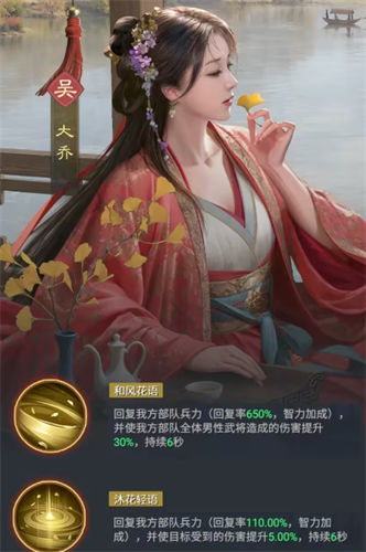 第二个为大家推荐的就是大乔,大乔目前在辅助定位上面是非常受欢迎的,她自身的技能效果可以给我方的角色带来650%的兵力恢复,这样的百分比在前期需要奶妈的情况下,是能够给大家带来足够恢复的,而且我方所有的武将如果上阵的其他角色都是男性武将的话,那么在这里,大乔给他们带来的提升,还有伤害数值上面30%的提升效果,虽然只有60的持续时间,但是根据这样的提升效果,大家可用的输出顺序也会变多,而且根据他的另外一个技能带来的110%兵力恢复也可以使用,根据对方造成伤害属性上面带来5%的提升,这样的输出增益以及治疗增益汇聚在大乔身上的时候,她的辅助效果就非常的万能了。