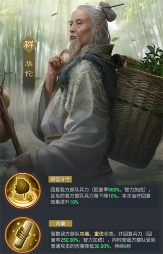 第四个为大家推荐的就是华佗,如果前期大家了解到游戏当中机制就是用奶妈的阵容就非常强的话,那么肯定就会了解到这里华佗的强度,因为他目前在游戏当中单体的治疗数值是目前能够达到最高的水平,使用悬壶济世这个技能的话,回复的我方兵力数值达到了900%的能力,根据目前兵力下降的数值,如果我方兵力数值每下降了10%的效果,那么他根据此次的技能效果就可以提升10%的兵力恢复,所以根据这样的技能在我方使用大招更多的情况下,它能够带来的恢复质量也就越多,敌方攻击越猛的情况下,周瑜带来的治疗效果反而更好用,后期在达到重伤状态的时候,还可以恢复250%的兵力效果。所以华佗可以说是当前目前最强的一个奶妈了。