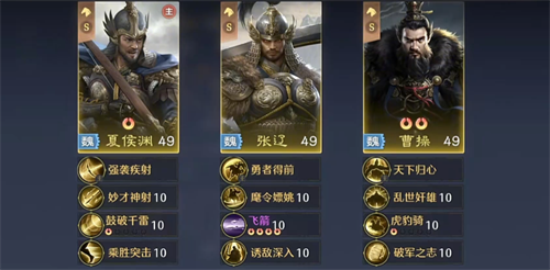 所以今天为大家介绍这个队的话,主要也就是追求的一个输出极致的输出效果,其中武将其实弱点上面就是本身的坦度其实是不够的,这一点的话大家看武将用的技能就可以看出来,大家可以先看一下夏侯渊是有两个S的,这边一个是骑兵,一个是弓兵,然后在这个阵容当中大家一般用的是骑兵来进行搭配,因为这里为大家讲过虎豹骑的效果,灵活度更高,而且相对阵容加成效果来说更适配当前的阵容武将,如果换其他的武将可能是可以用弓兵搭配的,那么主要讲这个阵容的话用骑兵肯定是要比他带这个诸葛连弩的弓兵效果要强很多的。