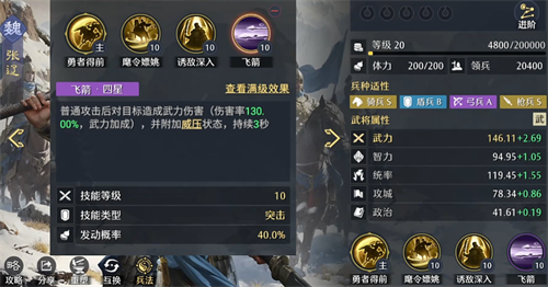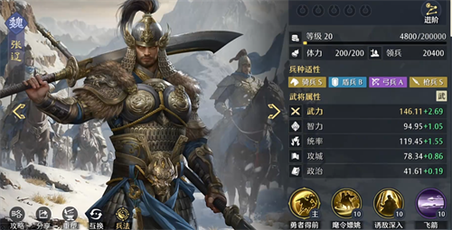 而且同时这里的张辽在配合效果上面也是突出的骑兵的效果,一般他在整体的骑兵效果上面都会有一定的整体阵容加成效果,当然大家肯定比较好奇的是这里为什么夏侯渊有这么强大的输出能力,因为放在很多阵容当中其实夏侯渊是需要靠其他的武将来收割的,但是放这里的话他的强度主要来源于他的主动技能,因为他主动技能是在使用一次之后,还有一定概率再触发一次的,两次连接的效果基本中间的时间也非常进,而且这个伤害倍率非常高,是有700左右的数值,然后他有30%左右的概率再触发一次,所以放这里强度很高。