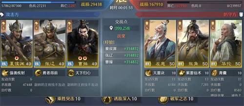用他技能的时候就是利用武将突击过来就打18秒,火力足够就可以趁这18秒之内直接秒,秒不了的情况下大家也可以选择撤,然后再加上破军之志,就是我方主将的提升伤害50%的效果,那就把夏侯渊的这个伤害能力拉到了一个极致,这也就是这套阵容的一个组合技能搭配的效果,通过阵容的核心来说的话,当然是肯定需要张辽作为其中既定武将使用的,张辽跟曹操放在一起的话作为一个绝对辅助能够给夏侯渊带来的增伤可以做到极致。