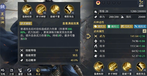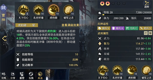 然后在背后也可以让曹操的技能派上用场,因为曹操他自己的自带技能是可以提升这个我方部队的主动战法和突击技能的发动概率,这虽然提升的效果不是很高,但是后面的主动战法和突击战法的伤害会提升10%,这个其实很厉害,就等于原来夏侯渊的伤害已经提升了40%的情况下,还能再加10%,提升50%,然后同时携带虎豹骑还能触发高概率的突击,和技能的伤害,然后曹操同时还能提升这个部队在地图当中的移动效率。