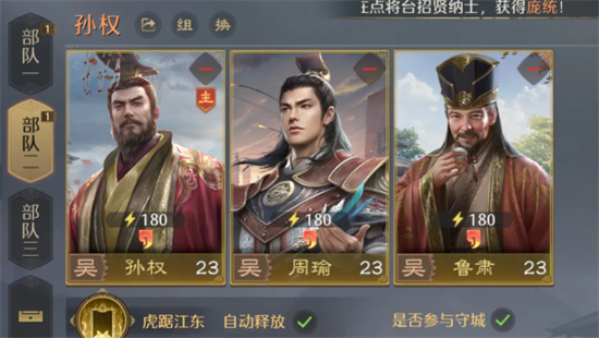 在搭配阵容时,可以选择周瑜、鲁肃,还有孙权等人。在这一个阵容中,孙权是主将。核心的作用是加快全队的技能循环,所以技能选择上应该要兼顾怒气回复,还有兵力续航。可以给孙权加怒气技能,可以让他更快的释放虎踞江东技能,同时搭配一个伤害回血技能。在保证输出的同时,还可以维持自身的兵力,可以避免过早退场。孙权的兵力,还有骑兵的士性,全部都是s级,领兵达到14,200,统帅还有智力的属性都是很亮眼的,可以扛起主将的重任。