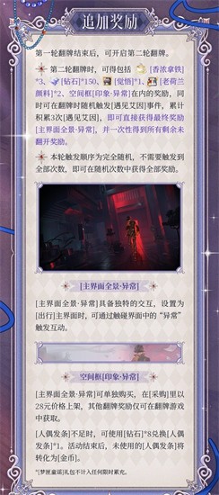 ► 完成第一轮翻牌后,可开启第二轮翻牌,可得[钻石]、[老荷兰颜料]、空间框[印象·异常]等奖励。同时可在翻牌时随机触发[遇见艾因]事件,累计积累3次[遇见艾因],即可直接获得最终奖励[主界面全景·异常],并一次性得到所有剩余未翻开奖励。