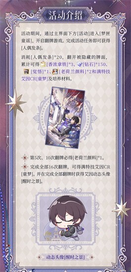 ► 完成活动任务获取[人偶发条],消耗[人偶发条]翻开被隐藏的牌面,可得[钻石]、[觉悟]、[老荷兰颜料]和艾因CR[童梦]等奖励。