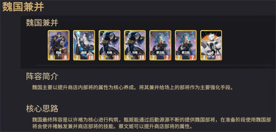 核心的思路会比较清晰,需要把商店里面的部将直接当成养料,可以通过兼并的机制去有效强化场上的核心。这套阵容的终极核心就是许褚,他的技能在准备阶段,可以兼并魏国武将,直接就可以吸取对方身上的属性。养到最后,这就等同于是移动堡垒。在这一套阵容中,甄姬也是不可以错过的,通过后勤的技能就可以给商店一直刷魏国武将,让许诸成为一个不会缺兼并的目标。蔡文姬就可以迅速的提升商店内每一个部将的基础属性,所以每一次的兼并都会更有价值。